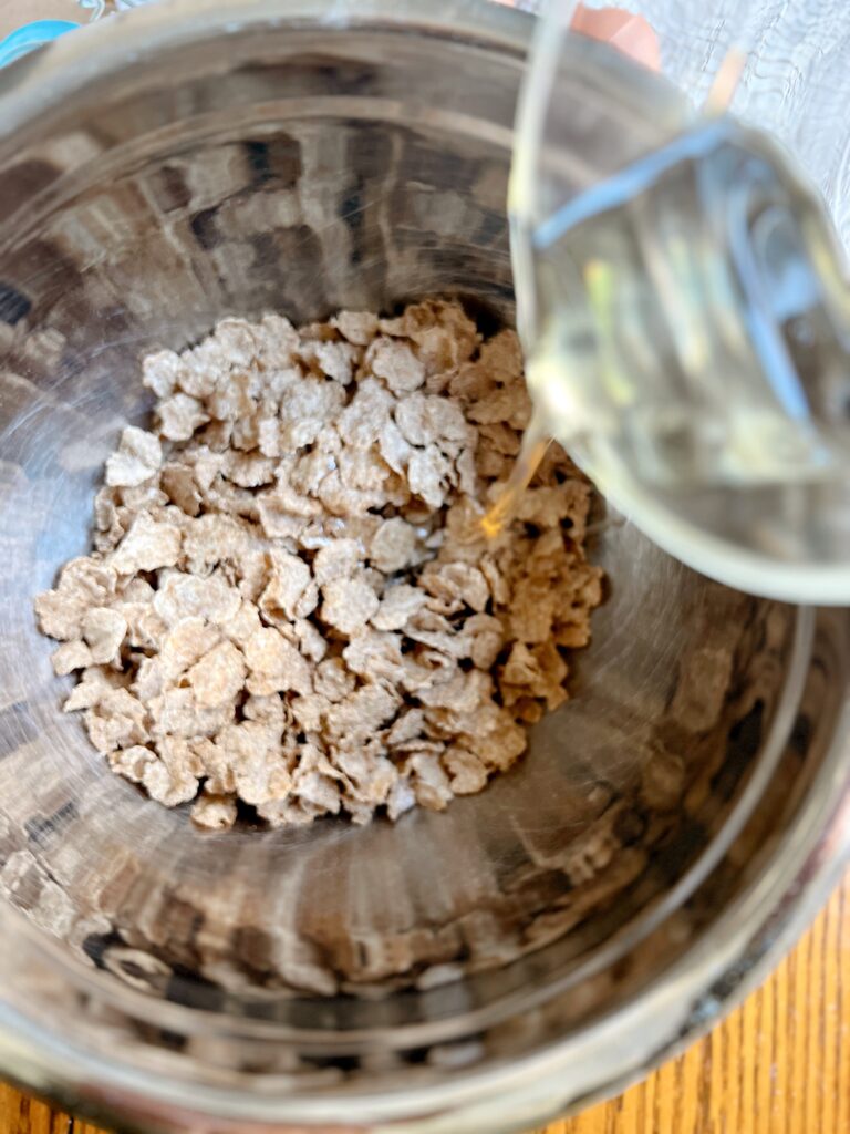 - Pour 2 cups of the bran cereal in large bowl and pour boiling water over it. Stir and set aside while assembling other ingredients.